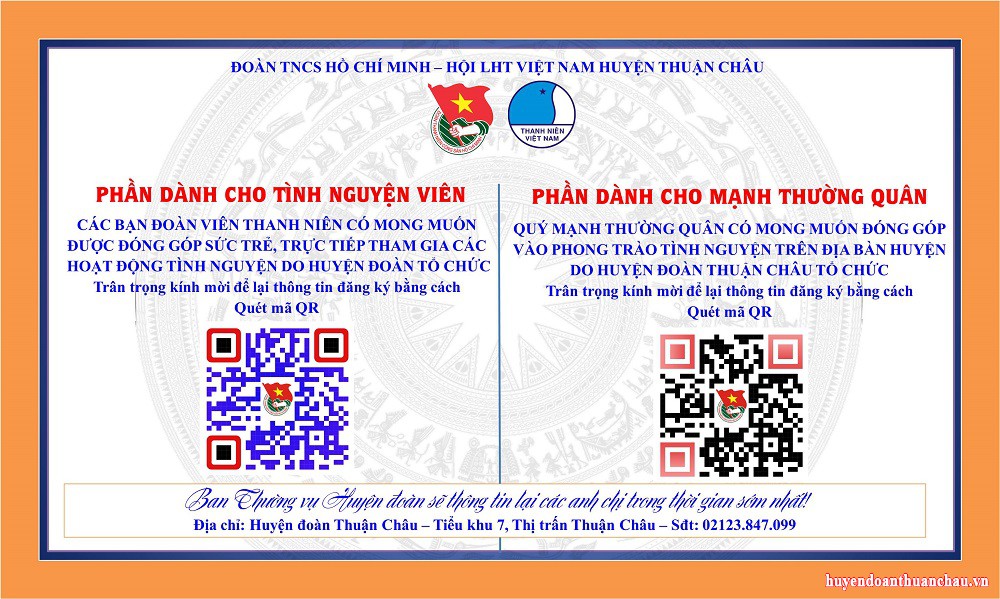Để thuận tiện hơn cho các quý mạnh thường quân, các cá nhân, tổ chức, các bạn đoàn viên thanh niên có mong muốn tham gia đóng góp cho phong trào tình nguyện của huyện Thuận Châu nói chung và các chương trình do Huyện đoàn tổ chức nói riêng. BTV huyện đoàn xin gửi tới các anh chị đăng ký nội dung tình nguyện bằng cách quyét mã QR để tham gia: