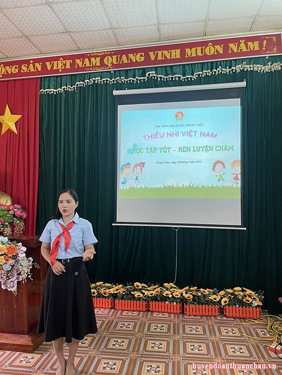 Hội đồng Đội huyện Thuận Châu tiếp tục triển khai Chương trình “Thiếu nhi Việt Nam - Học tập tốt, rèn luyện chăm” tới các Liên đội khối Tiểu học với 6 nhóm nội dung rèn luyện gồm: Thi đua học tốt, vận động khoẻ mạnh, bảo vệ môi trường, đọc sách mỗi ngày, chia sẻ yêu thương và rèn luyện kỹ năng và Chương trình “Tuổi trẻ Việt Nam - Rèn đức luyện tài, dẫn dắt tương lai” tới các Liên đội Khối THCS trên địa bàn huyện với 5 nội dung: Sống biết ơn và trách nhiệm, sống khát vọng và hành động, sống yêu thương và chia sẻ; sống bản lĩnh và kỷ luật, sống khỏe mạnh và an toàn.