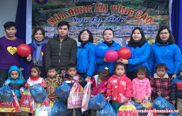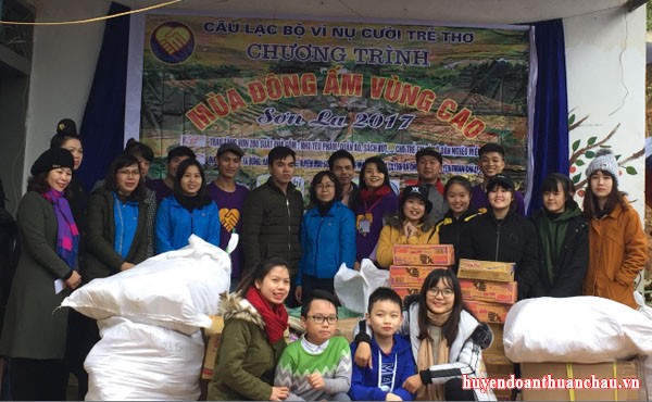 Đồng chí Vũ Quang Huy - Phó Bí Thư Huyện đoàn Thuận Châu và đoàn tình nguyện trao tặng quà