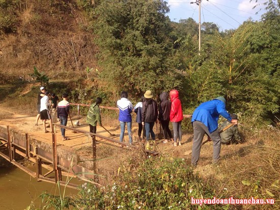 Đoàn viên thanh niên xã Thôm Mòn tham gia tu sửa, dọn dẹp Di tích lịch sử cầu Nà Hày
