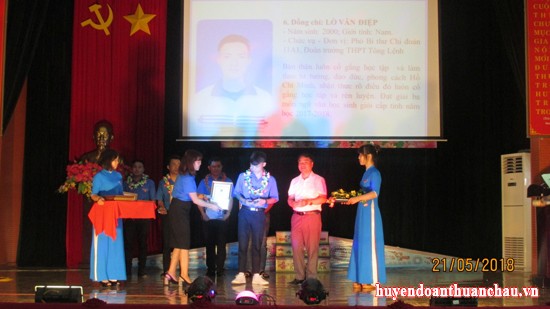 Đồng chí Lường Thùy Dung – Bí thư Huyện đoàn và đồng chí Nguyễn Đức Thặng – Phó Chủ tịch UBND huyện trao giấy khen và cúp lưu niệm cho đại biểu thanh niên tiên tiến