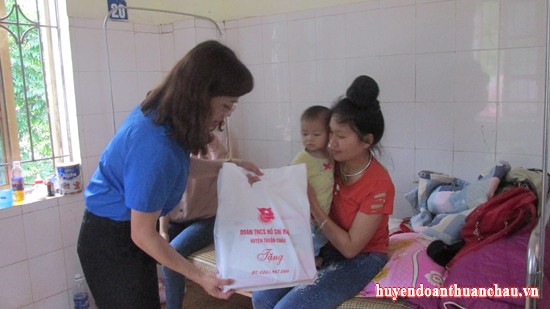 Thực hiện Chương trình công tác Đoàn và phong trào thanh thiếu niên năm 2018 của Ban Chấp hành huyện đoàn Thuận Châu; Nhằm phát huy vị trí, vai trò, trách nhiệm của tổ chức Đoàn đối với công tác chăm sóc, giáo dục thiếu niên nhi đồng. Nhân ngày Quốc tế Thiếu nhi 1-6, Ban Thường vụ huyện đoàn đã tổ chức thăm hỏi, động viên và tặng quà cho các em thiếu nhi đang điều trị bệnh tại Bệnh viện đa khoa huyện. Tham gia đoàn có đồng chí Lường Thùy Dung - Ủy viên BCH Đảng bộ huyện, Bí thư huyện đoàn; đồng chí Quàng Văn Châu – Phó Giám đốc Bệnh viện đa khoa huyện