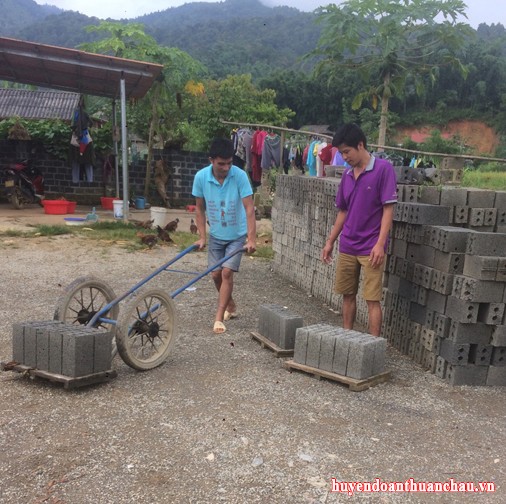Đồng chí Lò Văn Chanh đang xếp gạch để chuyển về kho