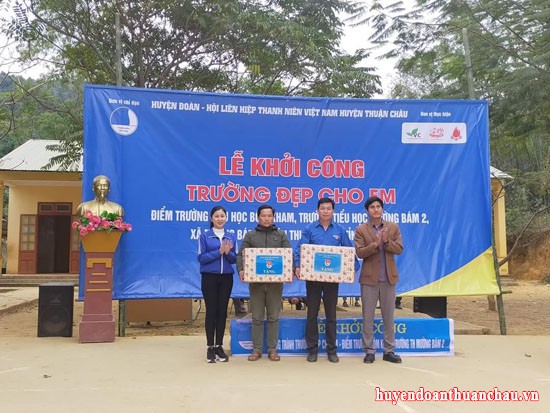 Đ/c Cầm Huyền Trang – Bí thư Tỉnh đoàn, đ/c Nguyễn Xuân Hoàng – Phó chủ tịch Ủy ban huyện, đ/c Thiệu Nam Bình – Trưởng phòng giáo dục huyện và đ/c Vũ Quang Huy – Bí thư Huyện đoàn tham gia lễ khởi công tại trường tiểu học Mường Bám 2