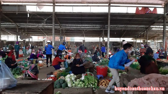 Đoàn cơ sở thị trấn phát tờ rơi tuyên truyền các biện pháp phòng chống Covid -19 tại chợ thị trấn Thuận Châu