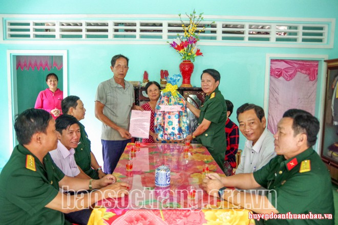 Đại tá Đỗ Tiến Sỹ - Phó Bí thư Thường trực Đảng ủy Quân sự, Chính ủy Bộ CHQS tỉnh (đứng thứ 3 từ phải sang) tặng quà cho gia đình chính sách. Ảnh: THANH NAM