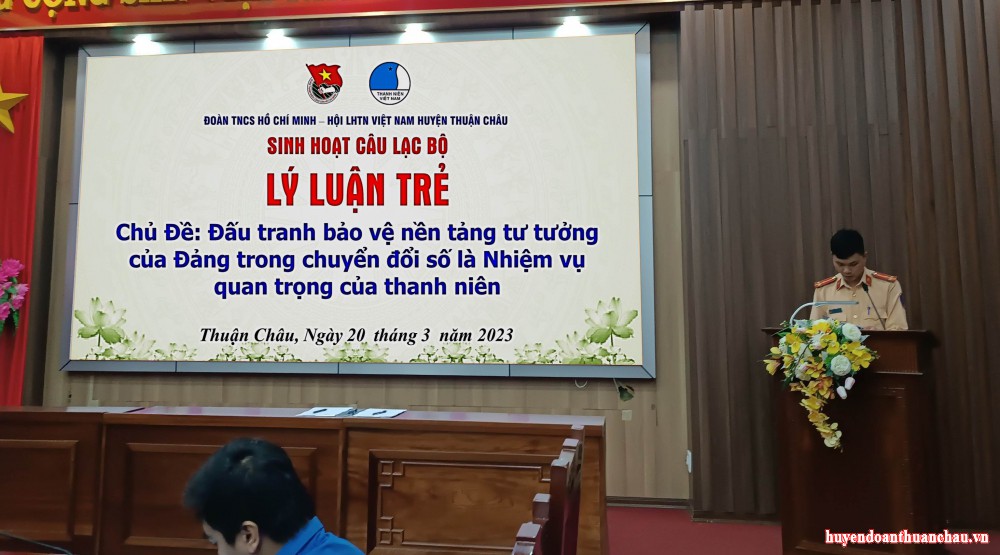 Đến dự buổi sinh hoạt có đồng chí Vũ Quang Huy, Bí thư huyện đoàn - Chủ nhiệm CLB Lý luận trẻ huyện Thuận Châu, Có đồng chí báo cáo viên là Đồng chí Hồ Văn Anh, UV BTV - Bí Thư đoàn Cơ sở Công an huyện; các thành viên của CLB và Các đồng chí Bí thư đoàn cơ sở trên địa bàn.
