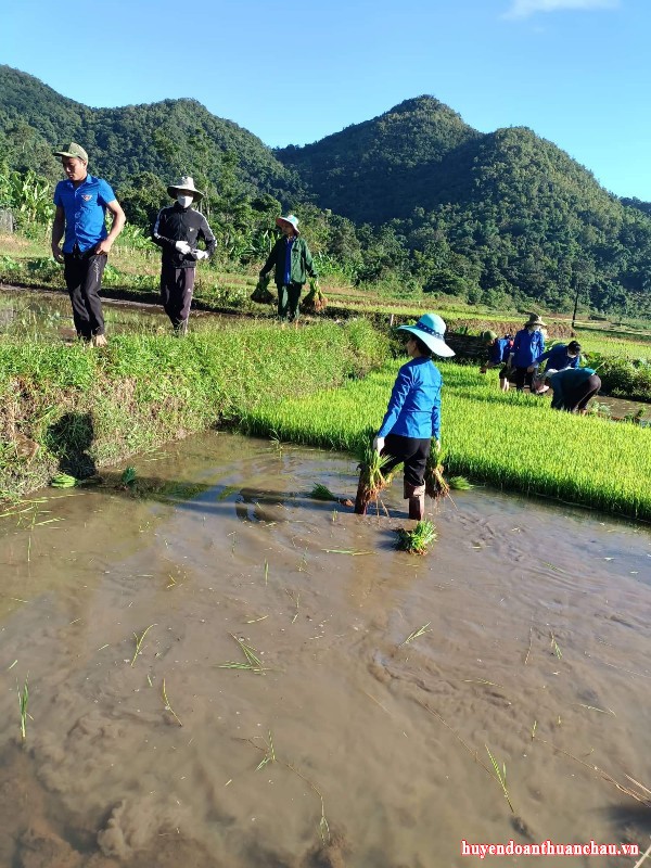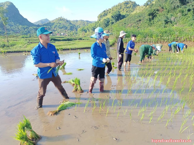 Đoàn viên đội hình hỗ trợ của đoàn xã Chiềng Pấc hăng say cấy lúa giúp đỡ gđ Quàng Văn Xôm