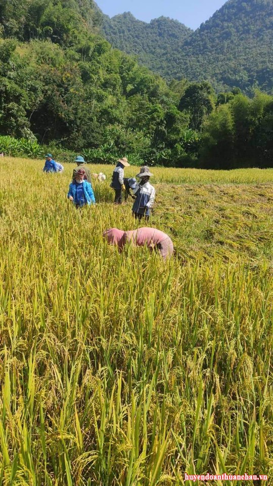 Đoàn viên đội hình hỗ trợ của đoàn xã Chiềng Pấc tiếp tục tham gia gặt lúa giúp đỡ gđ Quàng Văn Xôm